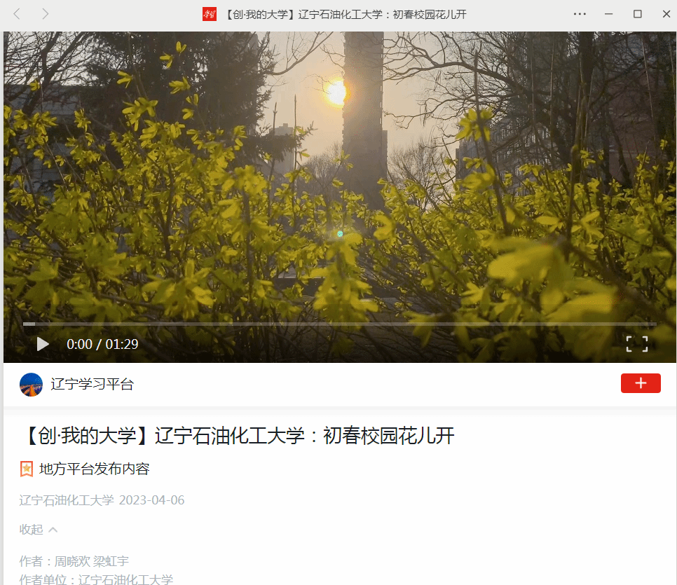 编者按:近日,学习强国主平台、中国大学生在线、人民日报客户端·人民号、辽宁日报·北国号等媒体平台对我校初春校园美景视频进行了宣传报道。现将相关报道转载如下: