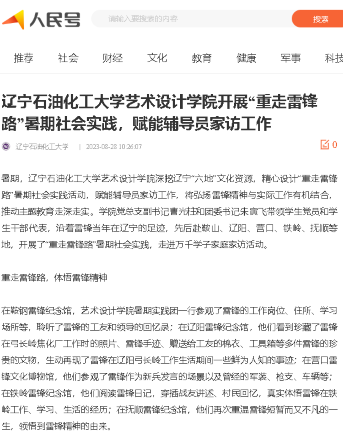 编者按:近日,人民日报客户端·人民号、辽宁日报·北国号对我校艺术设计学院暑期组织学生党员开展“重走雷锋路”社会实践,体悟雷锋的成长经历以及雷锋精神形成的过程,弘扬雷锋精神,赋能辅导员家访工作,传递辽石化大真情活动进行了宣传报道。现将相关报道转载如下: