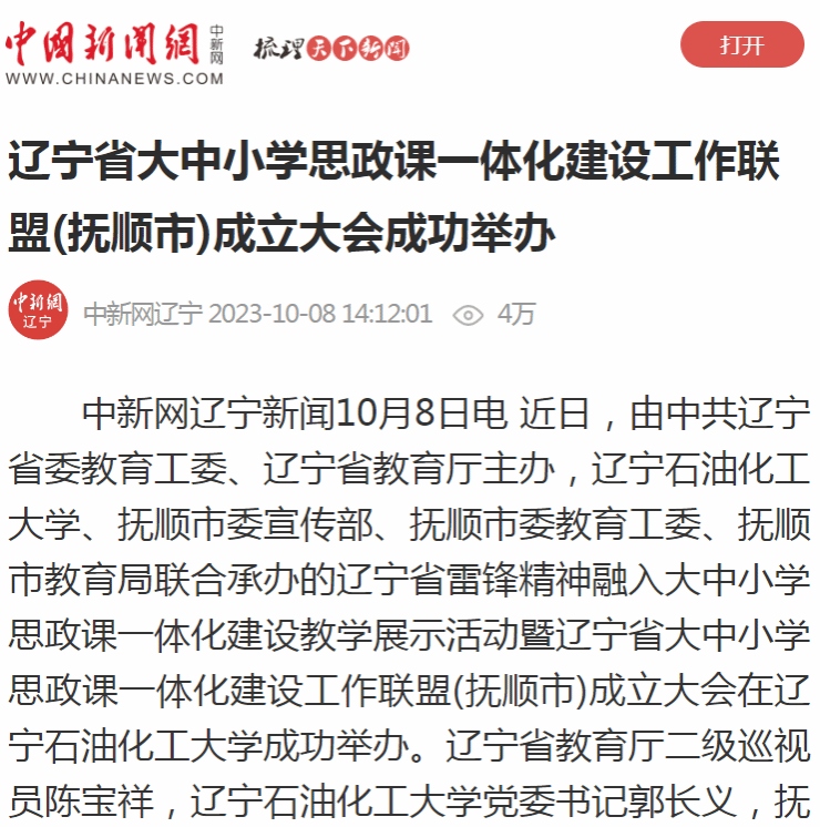 编者按:近日,光明日报客户端、全国高校思想政治工作网、中新网辽宁、东北新闻网、北斗融媒、辽宁日报·北国号、人民日报客户端·人民号等媒体平台对我校承办的辽宁省雷锋精神融入大中小学思政课一体化建设教学展示活动暨辽宁省大中小学思政课一体化建设工作联盟(抚顺市)成立大会成功举办进行了宣传报道。现将相关报道转载如下:
