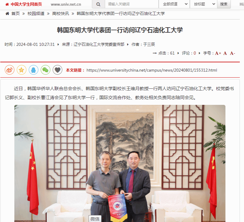 编者按:8月1日,辽宁日报·辽望号、中国大学生网、人民日报客户端·人民号、搜狐号对韩国华侨华人联合总会会长、韩国东明大学副校长王维月教授一行两人访问我校进行了宣传报道。现将相关报道转载如下: