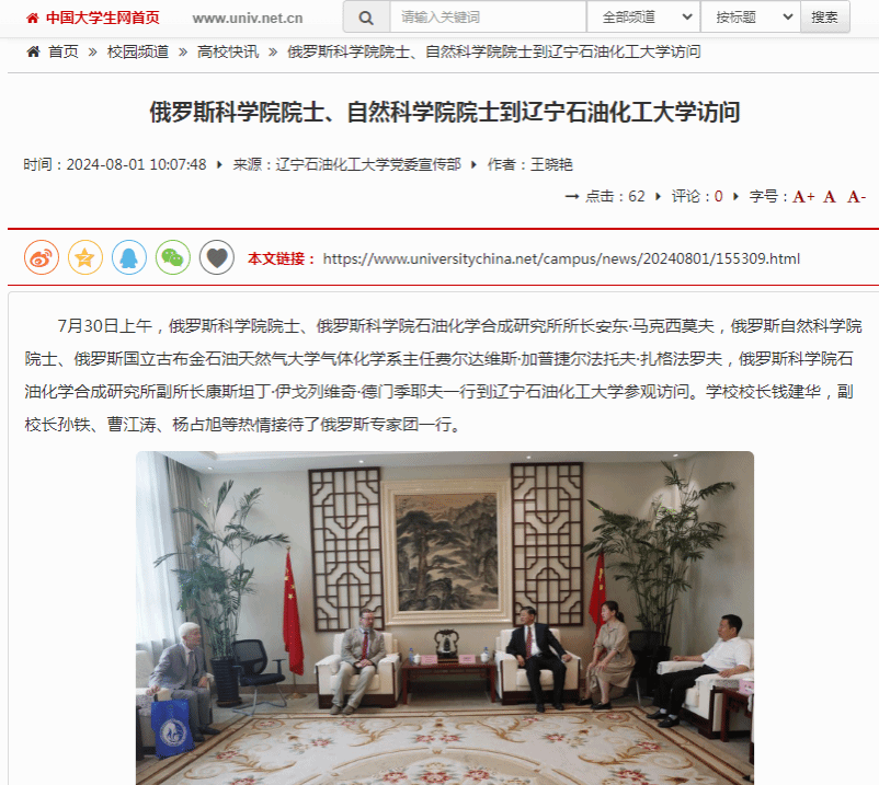 编者按:8月1日,辽宁日报·辽望号、中国大学生网、人民日报客户端·人民号、搜狐号对俄罗斯科学院院士、俄罗斯科学院石油化学合成研究所所长安东·马克西莫夫,俄罗斯自然科学院院士、俄罗斯国立古布金石油天然气大学气体化学系主任费尔达维斯·加普捷尔法托夫·扎格法罗夫,俄罗斯科学院石油化学合成研究所副所长康斯坦丁·伊戈列维奇·德门季耶夫一行到我校参观访问进行了宣传报道。现将相关报道转载如下: