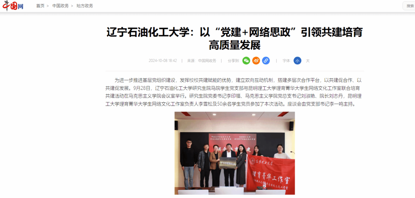 编者按:近日,中国网(客户端)对我校研究生院马院学生党支部与昆明理工大学理育菁华大学生网络文化工作室联合培育共建活动进行了宣传报道。现将相关报道转载如下: