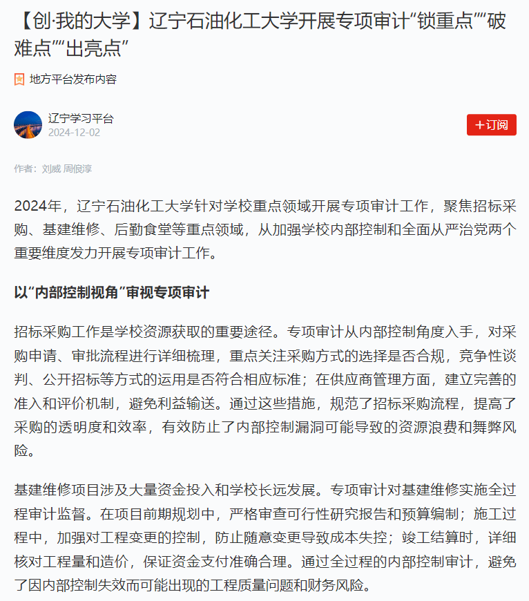 编者按: 2024年,国产亚洲综合一区二区三区_亚洲欧美日韩中文天堂_尤物在线观看视频不卡无码_国产最新精品亚洲2025不卡_亚洲成Av人在线观看片水蜜桃针对学校重点领域开展专项审计工作,聚焦招标采购、基建维修、后勤食堂等重点领域,从加强学校内部控制和全面从严治党两个重要维度发力,开展专项审计工作。学习强国辽宁学习平台、北国网对此进行了宣传。现将相关报道转载如下: